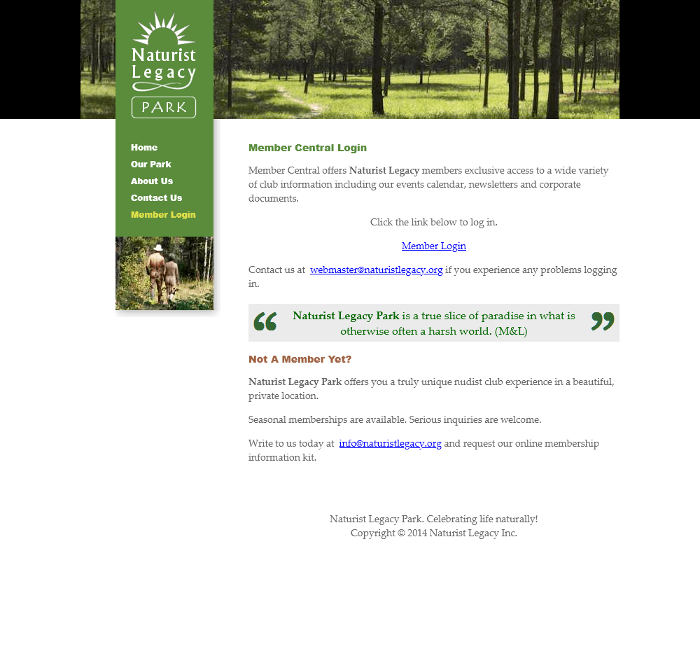 This website and Naturist Legacy's website each have password-protected areas that contain non-public information available exclusively to members.